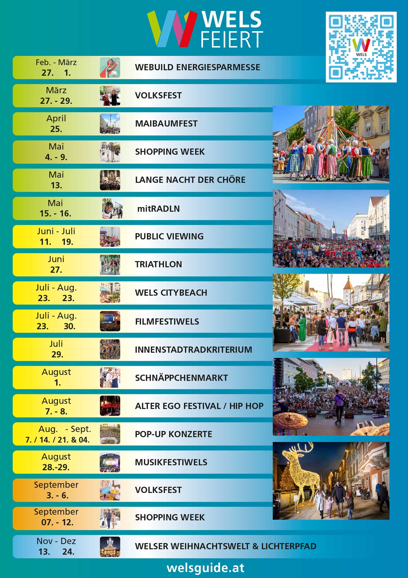 Wels ist ein Ort, an dem man gerne lebt, sich wohlfühlt und an dem keine Langeweile aufkommt. Die Mischung aus abwechslungsreichen Veranstaltungen, wunderschönen Plätzen und vielfältigen Sport- und Freizeitmöglichkeiten sorgt für eine sehr hohe Lebensqualität.