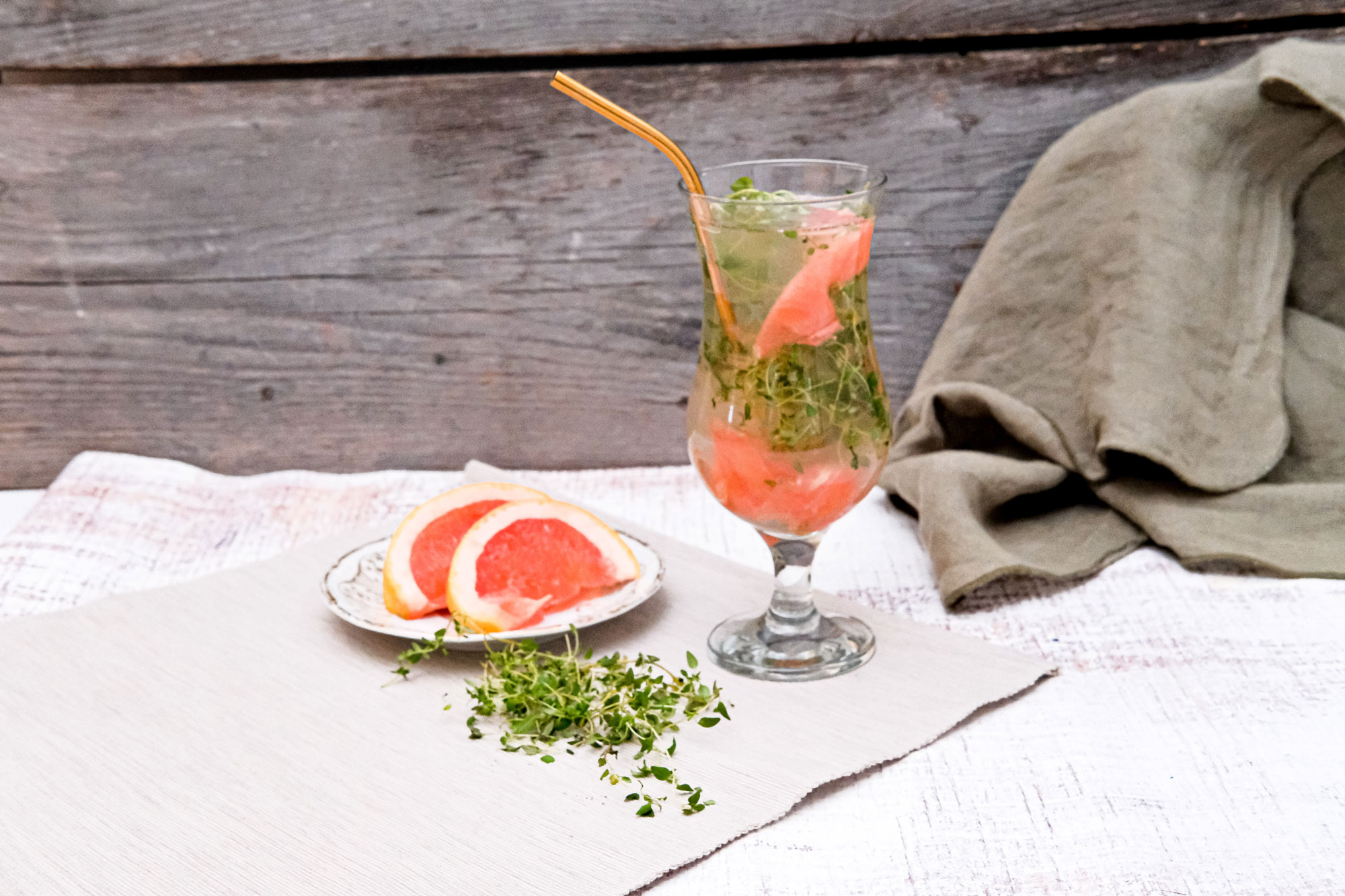 4 EL Tschin Tschin Sirup, frischer Thymian, 1 Grapefruit